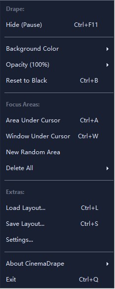 CinemaDrape官方版是一款非常便捷的桌面关灯软件,CinemaDrape官方版软件体积小巧、专业实用,软件还能够指定电脑桌面某一块区域显示并将其他区域关灯的工具,通过软件能有效的提高用户的专注度,无论是看电影还是工作,利用软件都可以实现关灯模式。