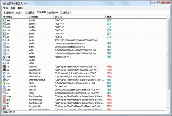 注册表修复工具基本介绍:1.系统启动项查看和编辑,包括常规启动、任务计划、登录启动等设置。 2、DLL插件查看和修复,包括explorer插件、IE插件和右键菜单插件等。3、系统服务管理,可查看和编辑系统所有Win服务。